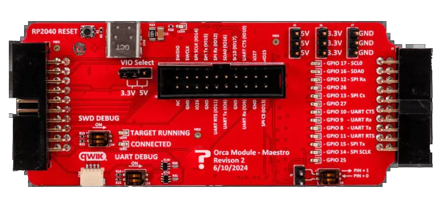 The Maestro Orca is a troubleshooting and development tool for FREE-WiLi. The board consists of a USB debugger for the RP2040 main controller and IO test points.
